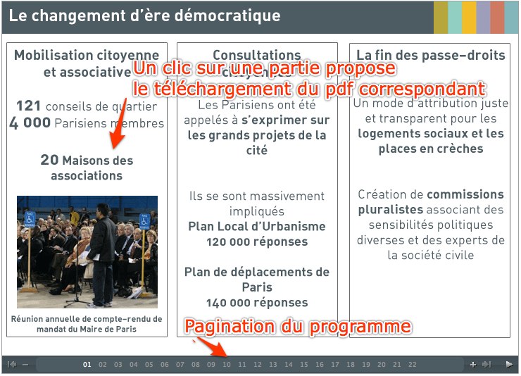 Evidemment en structurant autour de point clés cette présentation comme on le ferait pour un programme. A Paris ou Bordeaux, je vois que les maires sortant propose essentiellement des fichiers pdf, ce qui vraiment ne pousse pas à la lecture et n’est pas très ergonomique. On est vraiment dans la logique du tract ou document papier à peine transformé pour mise en ligne alors que les médias sont totalement différents. Il est bon d’avoir une version pdf, car facilement imprimable pour ce type d’information parfois technique et longue, pour autant une version en ligne est nécessaire pour une première approche. Delanöé présente au format flash un accès assez commode à son bilan mais le format flash forme un ensemble assez fermé sur lui-même, qui par exemple n’est pas du tout optimal en terme de référencement.